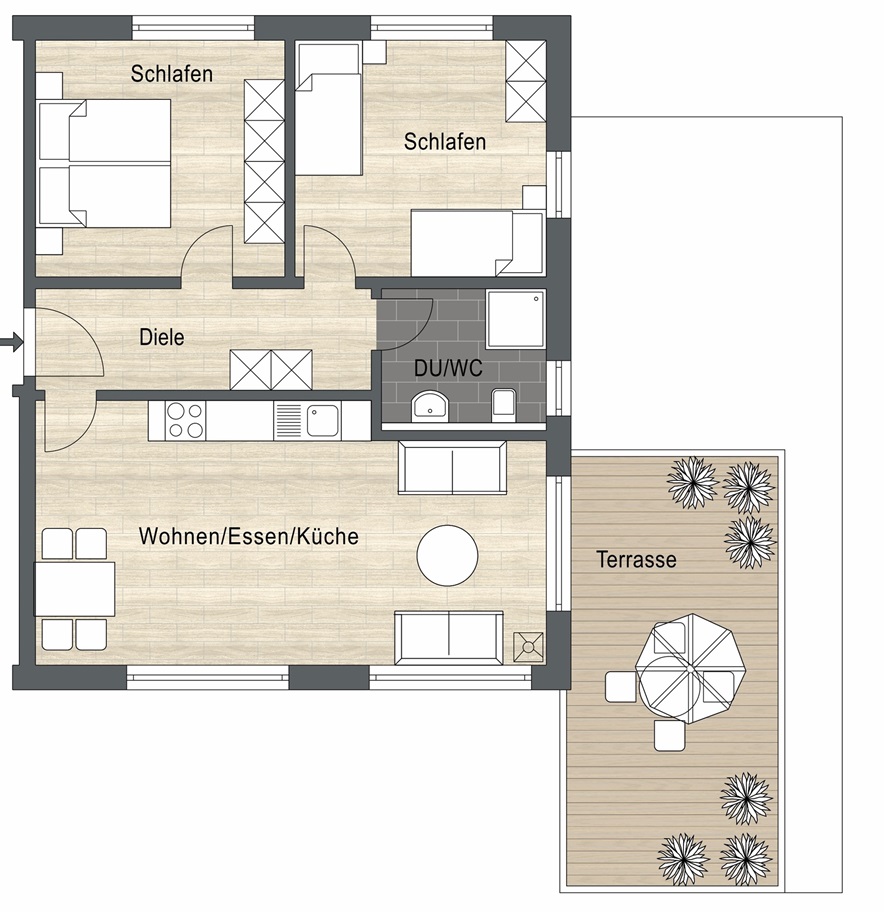 - In allen Wohn- und Schlafräume Holzboden